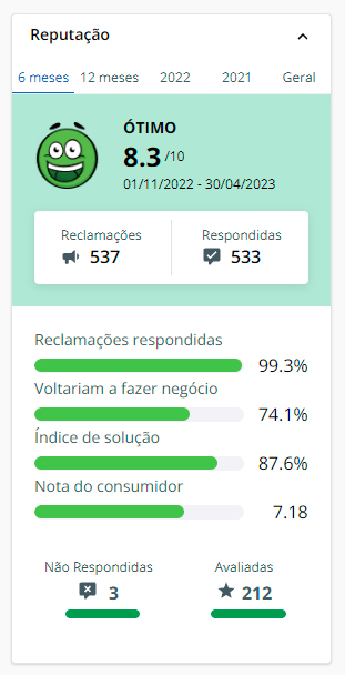 Reputação: Nota 8.3 / 10 no site reclame aqui!